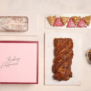 המארז כולל : אוזני המן קלאסיות 5 יח', עוגיות ויין רוזה 375 מ"ל